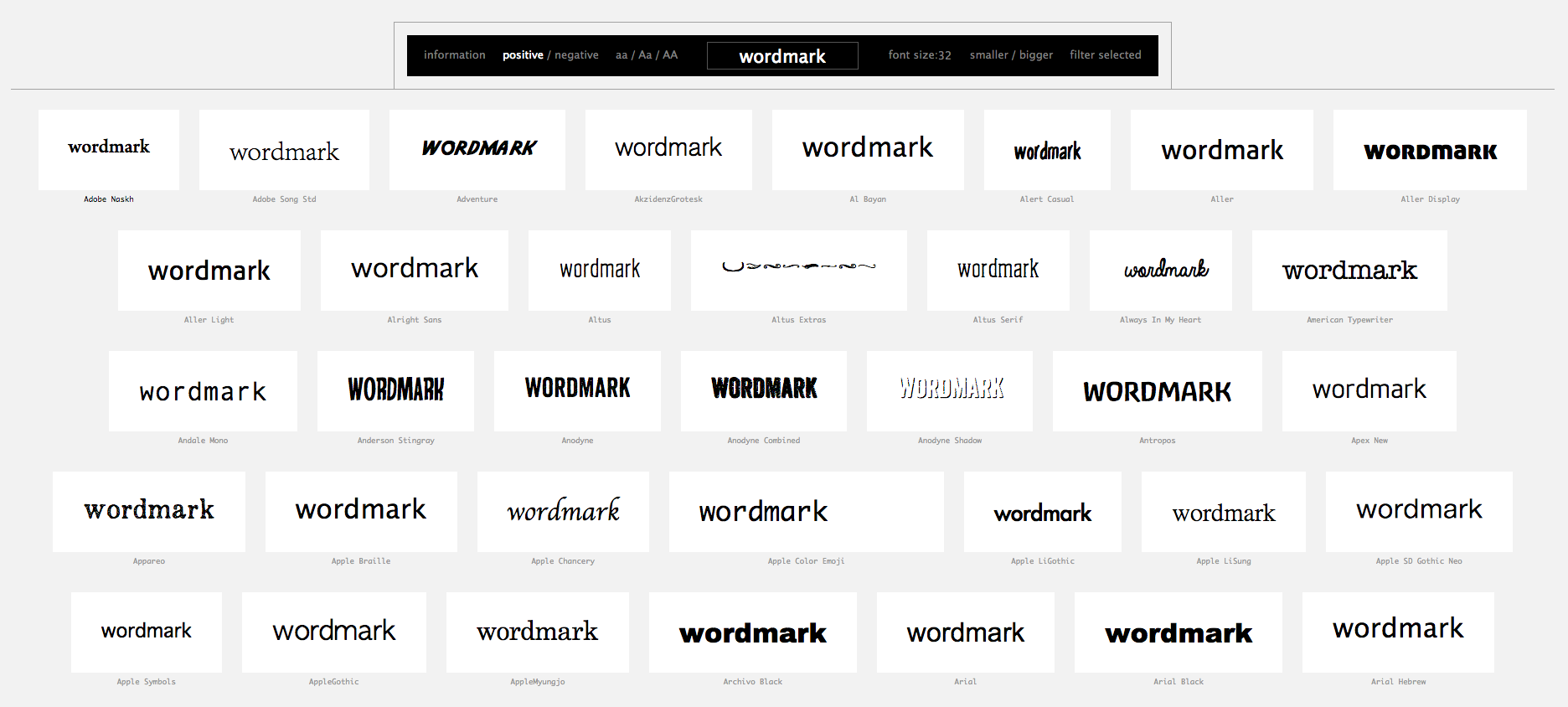 Wordmark.it is a online tool that previews all your fonts and allows you to test words in every single font installed on your computer. This makes for much faster type testing, to find that font you are looking for, faster.